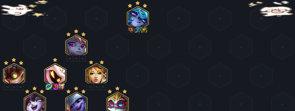 〖Three〗、阵容构成:御手(诺手)、仙巫(露露)、青山狐(阿狸)、御刃(卡特)、邪恶小法师(小法)、圣灵之锤(波比)。羁绊构成:3法师、3约德尔人、2帝国、2骑士。核心玩法:强化后补奴影单,2秘术双生,装备分配以卡特和小法为主。