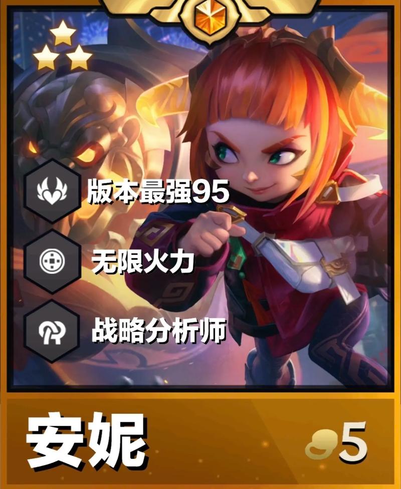 〖Two〗、在5-6人口时,尽快找到3星安妮,并优先保留护卫棋子。凑出4emo4护卫3超级粉丝的阵容,利用三星安妮的高额输出和4护卫的厚盾,中期几乎无敌。后期运营:8人口阶段实现黄金军团,达成锁鸡的目标。此时6护卫的盾非常厚实,加上安妮的高额输出,即使面对大成死歌、卡牌等强力阵容也能轻松应对。
