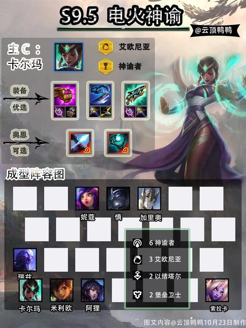 〖Four〗、阵容搭配- 奕子选取:卡尔玛、洛、卡蜜尔、贾克斯、赫卡里姆、莫甘娜、基兰、巴德、米利欧。羁绊组合- 1编蝠女王、4时间学派、4复苏者、3魔战士、2花仙子、2学者。这些羁绊能够大幅提升阵容的输出、生存和控制能力。装备配置- 抢装顺序:女神泪、大剑、反曲弓、锁子甲、负极斗篷。