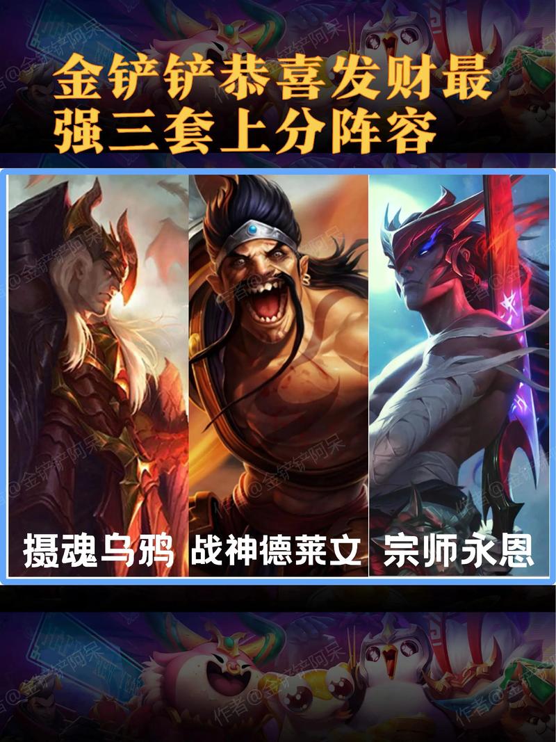〖One〗、《金铲铲之战》恭喜发财激发之匣乌鸦阵容搭配推荐如下:阵容组成 核心成员:刀妹、锐雯、乌鸦(斯维因)、狗头、永恩、奥拉夫、莫甘娜、小炮、德莱文。羁绊搭配 关键羁绊:1武财神、3战神、4摄魂使、3龙魂、2玉剑仙、2天神、1浪人、2神射。