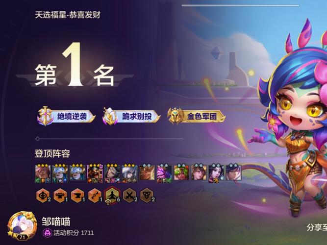 〖Two〗、在金铲铲之战中,“恭喜发财”阵容的组建与玩法如下:阵容组成: 核心英雄:阿兹尔、内瑟斯、亚托克斯、卑尔维斯、奎桑提、纳亚菲利、塔莉亚、卡西奥佩娅、雷克顿。羁绊组合: 主要羁绊:9恕瑞玛,以提升阵容的整体强度和配合效果。 次要羁绊:2暗裔、1女皇、1主宰,以增强阵容的多样性和战斗力。
