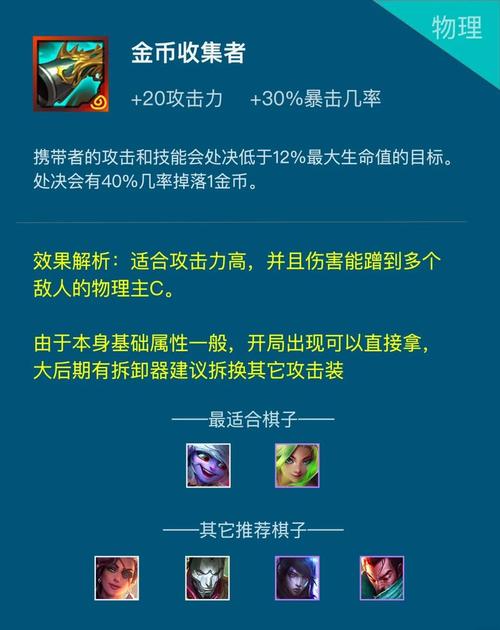 〖Three〗、金铲铲之战中,腕豪要实现一W秒人的出装策略,可以借鉴以下方案:初期装备选取:提亚马特:初期先出提亚马特,帮助瑟提快速清线,同时提供一定的伤害,为后续的战斗打下基础。