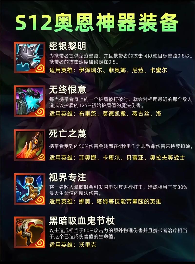 吸血鬼权杖:+50%攻速。携带者无法放技能,普攻造成50%额外伤害并治疗自己。适合凯隐(放完技能后使用)等。无终恨意:+420生命值,+68护甲。护盾被打破时对最近敌人造成护盾值50%魔法伤害。适合亚索、锤石、俄洛伊、加里奥、洛等技能带护盾的弈子。飞升护符:+200生命值,+66%攻击,+66法强。