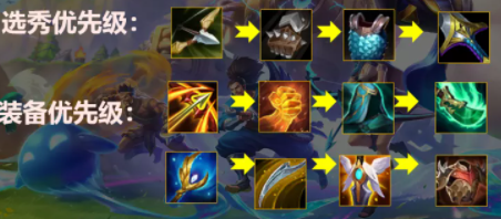 主C卡莎:核心装备为朔极之矛(暴风大剑+女神之泪)、巨人杀手(暴风大剑+反曲之弓)、珠光护手(无用大棒+拳套)。备选装备包括正义之手、飓风、羊刀。主T瑟庄妮:推荐装备狂徒铠甲(巨人腰带+巨人腰带)、石像鬼石板甲(锁子甲+负极斗篷)。备选装备有棘刺背心、日炎披风。