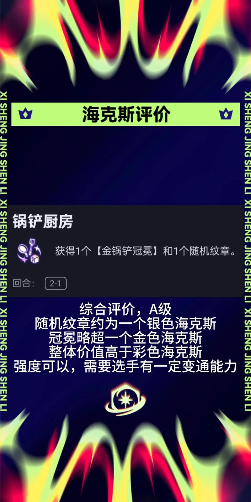 〖Four〗、金铲铲海克斯的出现规律如下:阶段发放规律:初期阶段:在游戏初期,阶段1到4,玩家会获得一次海克斯强化。中期阶段:进入阶段3到3时,会再次发放海克斯强化。后期阶段:在阶段4到6,玩家会获得最后一个海克斯强化。选取机制:三个选项:每次发放海克斯强化时,玩家都会面临三个选项进行选取。