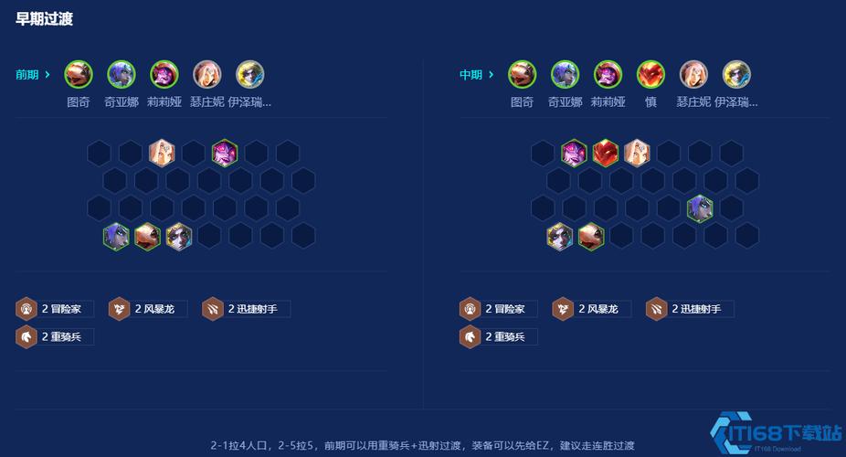 〖Three〗、开局:多弓、多大剑为优势开局,留能到2的前排搭子,如2护卫2格斗。前期节奏:正常打连胜升级,2-1升4,2-5升5,3-2升6,4-1升7。打工推荐:后排固定2神射,其他混搭2护卫2格斗2风暴2重骑。中期分支:逆风局:7级开D找1张霞替换EZ,挂3怒翼锁血上8。顺风局:靠EZ强势打工上8搜全队2星。