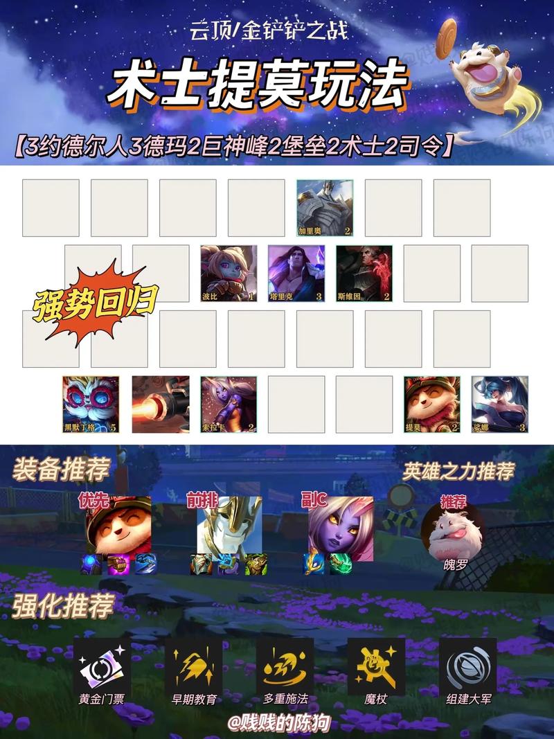 〖Three〗、核心英雄:宇航员提莫。作为阵容的核心,宇航员提莫拥有强大的输出能力和快速穿梭战场的技能“星际漫游”。辅助英雄:星界守护者(提供护盾和能量回复)、虚空掠夺者(具有强大的单体爆发能力)、天启者(提供团队加速和位移技能)、魔法射手、凛冬之怒、驭剑游侠、影哨。