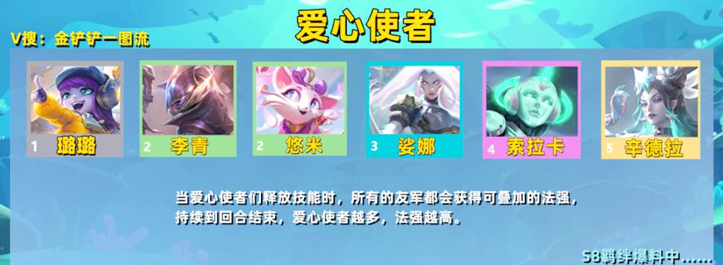 金铲铲之战S8赛季的羁绊主要包括以下这些:爱心使者羁绊:友军释放技能时,所有友军获得法术强度加成。羁绊英雄有璐璐、李青、悠米、娑娜、索拉卡、辛德拉。灵能使羁绊:获得额外法术强度,施法后充能下一次普攻,造成魔法伤害。羁绊英雄包括拉克丝、安妮、娑娜、乐芙兰、塔利亚。