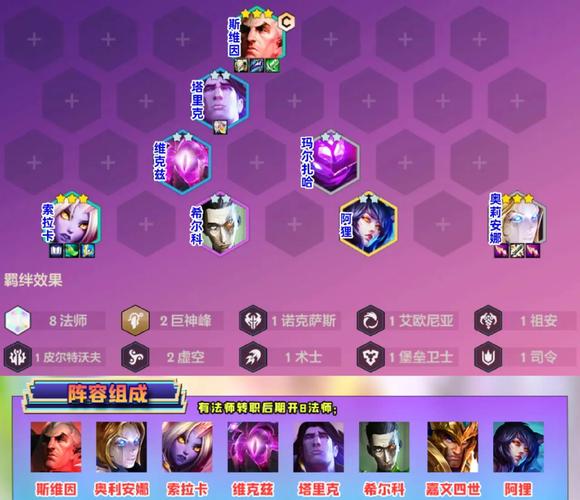〖Three〗、核心英雄:乌鸦(斯维因)、奶妈(索拉卡)、宝石、拉克丝、阿狸、皇子、大眼(维克兹)、蚂蚱(玛尔扎哈)、发条 羁绊搭配:8法师、2巨神峰、2司令 强化符文推荐 刚需:恶魔耀光,这是阵容的核心强化符文,能大幅提升乌鸦的输出能力。