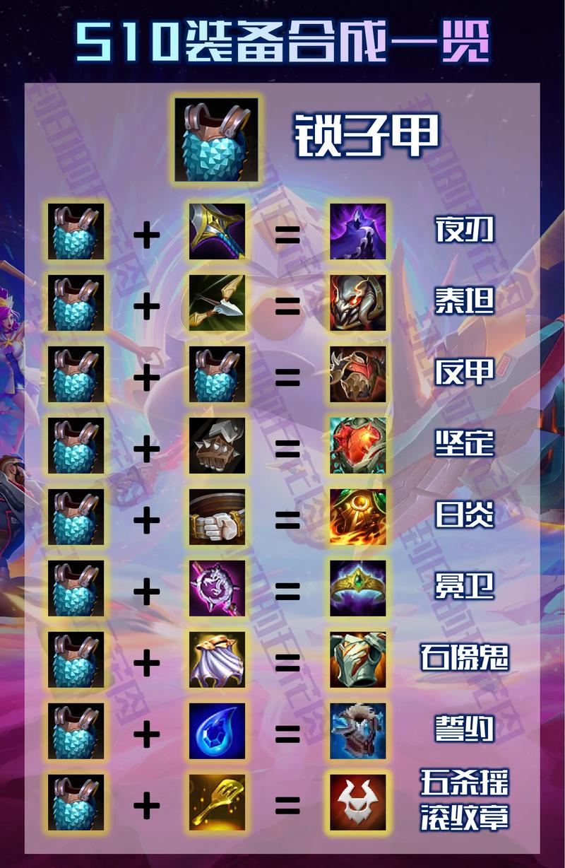 〖Two〗、合成被动特性:金铲铲可以好多个装备进行合成,主要的合成道具为帝国纹章。暴风大剑组合帝国纹章、反曲之弓组合挑战者纹章、无用大棒组合黑法师纹章、眼泪组合学院纹章、锁子甲组合辛迪加纹章、负极斗篷组合炼金纹章、大腰带组合变异纹章、大腰带组合变异纹章、暴击拳头组合刺客纹章。