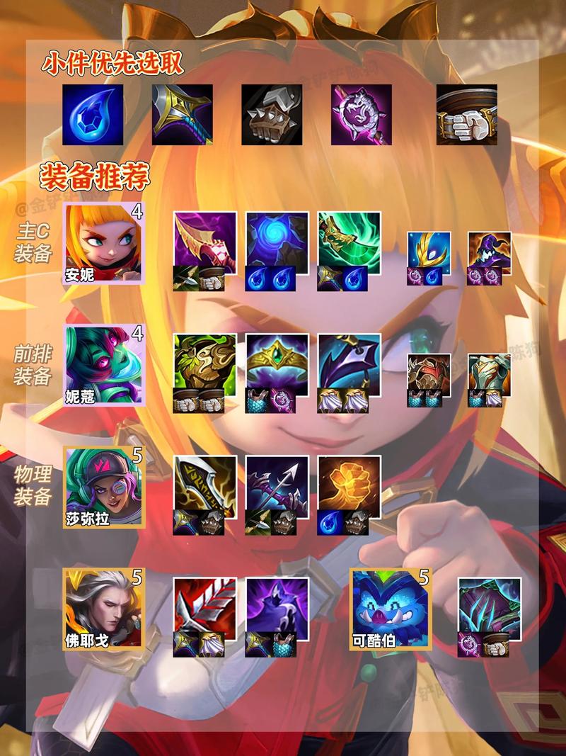 阵容构成:崔斯特、斯卡纳、厄运小姐、德莱厄斯、阿萝拉、古拉加斯、布隆、萨科、克格莫。强化推荐:优选辛迪加之徽、潘多拉的装备、光明重构器;次选商店故障、基础装备自助餐、星夜等。