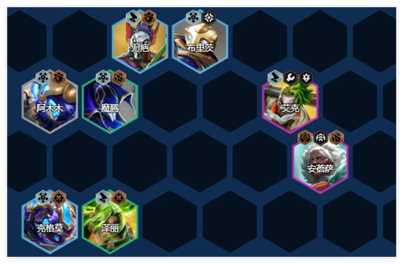 阵容组成:雷克赛、蔚、塔姆、瑟庄妮、嘉文四世、刀妹、希维尔、卢锡安。羁绊组成:4海克斯:战斗环节开始时和之后的每6秒,发射脉冲为友方海克斯科技弈子提供护盾,并附带额外魔法伤害。4格斗家:队伍获得最大生命值加成,格斗家们获得双倍加成。4强袭战士:强袭战士们获得额外攻击力。