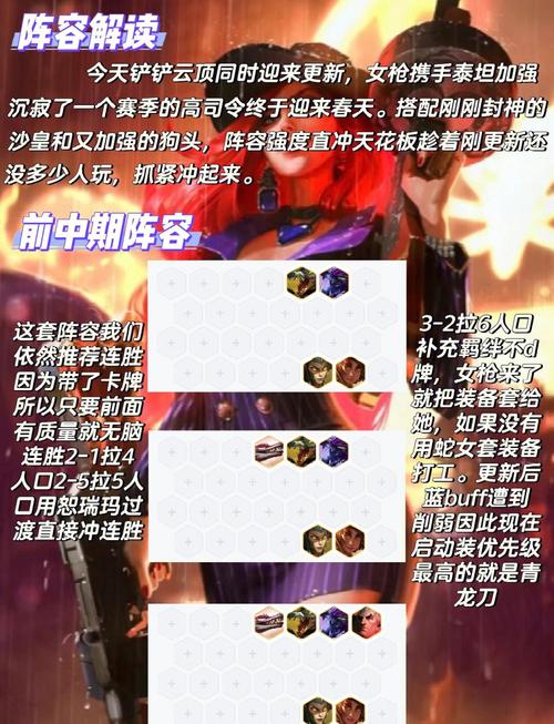 特点:回血能力极强,上分神器。核心英雄:奶妈(主C),加里奥(主坦)。羁绊效果:以巨神峰和神谕者为主。装备推荐:奶妈装备法爆、大天使、科技枪;加里奥装备板甲、龙牙、反甲。裁决天使阵容 特点:超级强悍,大成吃鸡。核心英雄:天使(主C),波比(主坦)。