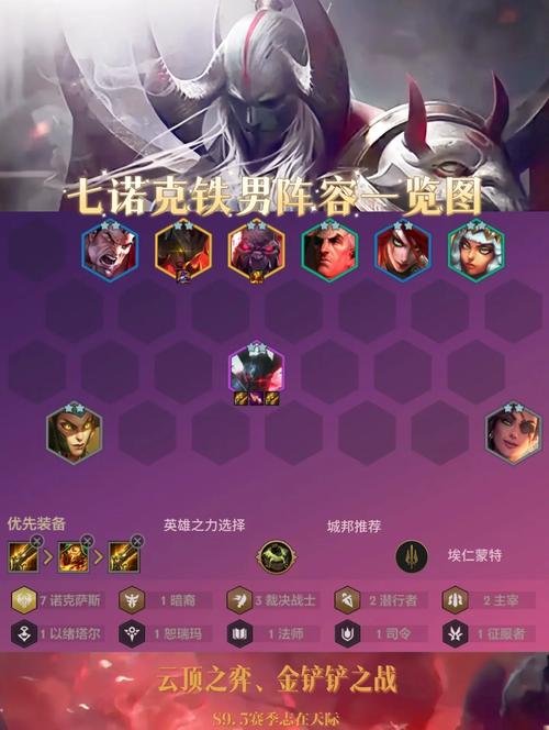 阵容组成 第一套阵容:烬、寒冰、诺手、乌鸦、卡特、塞恩、铁男、霞。这是一套较为均衡的阵容,拥有不错的输出与控制能力。第二套阵容(剑魔来的早且无珠光莲花):剑魔、诺手及其他适配英雄。这套阵容依赖剑魔的控制与诺手的输出。第三套阵容(7人口瑟提3星):瑟提、诺手及其他高费卡。