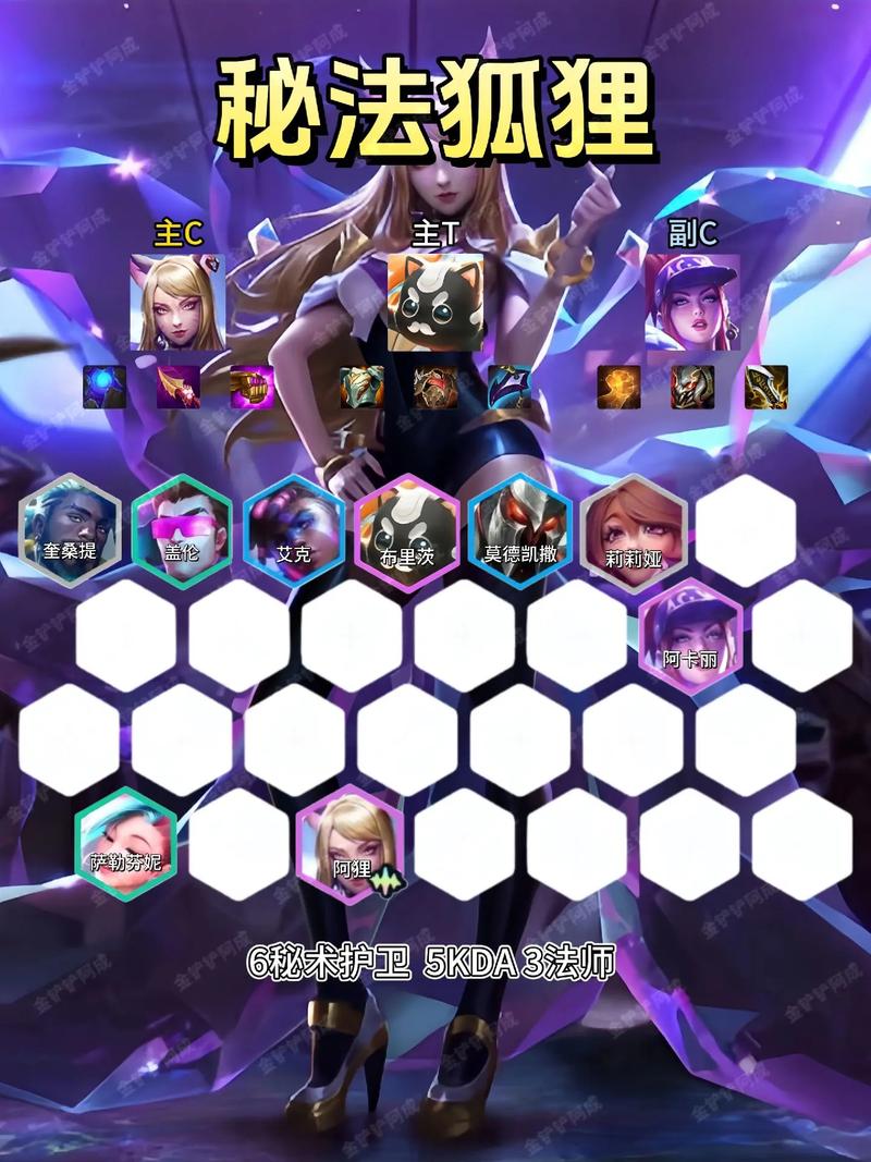 〖Five〗、《金铲铲之战》S10狐狸主C阵容搭配推荐如下:阵容组成 核心英雄:阿狸(主C)其他英雄:凯南、莉莉娅、妮蔻、艾克、奇亚娜、阿卡丽、劫羁绊组成 4真实伤害:提供高额的真实伤害输出。3KDA:增加KDA英雄的法术强度和攻击力。3超级粉丝:为超级粉丝英雄提供额外的法力值和生命值回复。