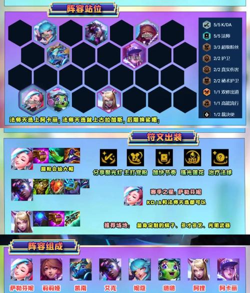 〖Three〗、阵容组成 萨勒芬妮为核心的阵容主要由以下英雄组成:萨勒芬妮、艾克、悠米、阿狸、辛德拉、猫咪(索拉卡)、凯南、露露。这套阵容兼具输出与控制,能够应对多种战斗环境。阵容羁绊 5法师:提供强大的法术输出能力。3KDA:为KDA英雄提供额外属性加成。2爱心使者:增加全体友军的法术强度。