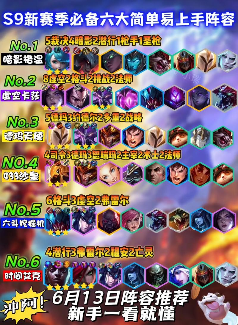 〖Two〗、金铲铲之战s9赛季T0阵容推荐:拼多多提莫阵容 核心成员:波比、提莫、加里奥、乌鸦、克烈、娑娜。阵容特点:成型快,锁血能力强,是测试服中最强势的赌狗阵容之一。关键在于6级时D出提莫、加里奥、乌鸦的三星,并尽量让提莫升至4星。祖安皮城枪阵容 核心成员:泽丽、杰斯、瑟庄妮、赛纳等。