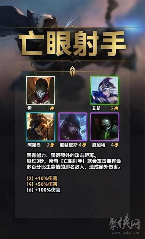 〖One〗、羁绊介绍:【征服者】的技能可以暴击,征服者获得暴击几率和暴击伤害。棋子组成:烬(1费)+艾希(2费)+诺手(3费)+霞(4费)+尼菈(4费)激活效果:(2征服者)15%暴击几率,10%暴击伤害。(4征服者)35%暴击几率,25%暴击伤害。(6征服者)55%暴击几率,40%暴击伤害。