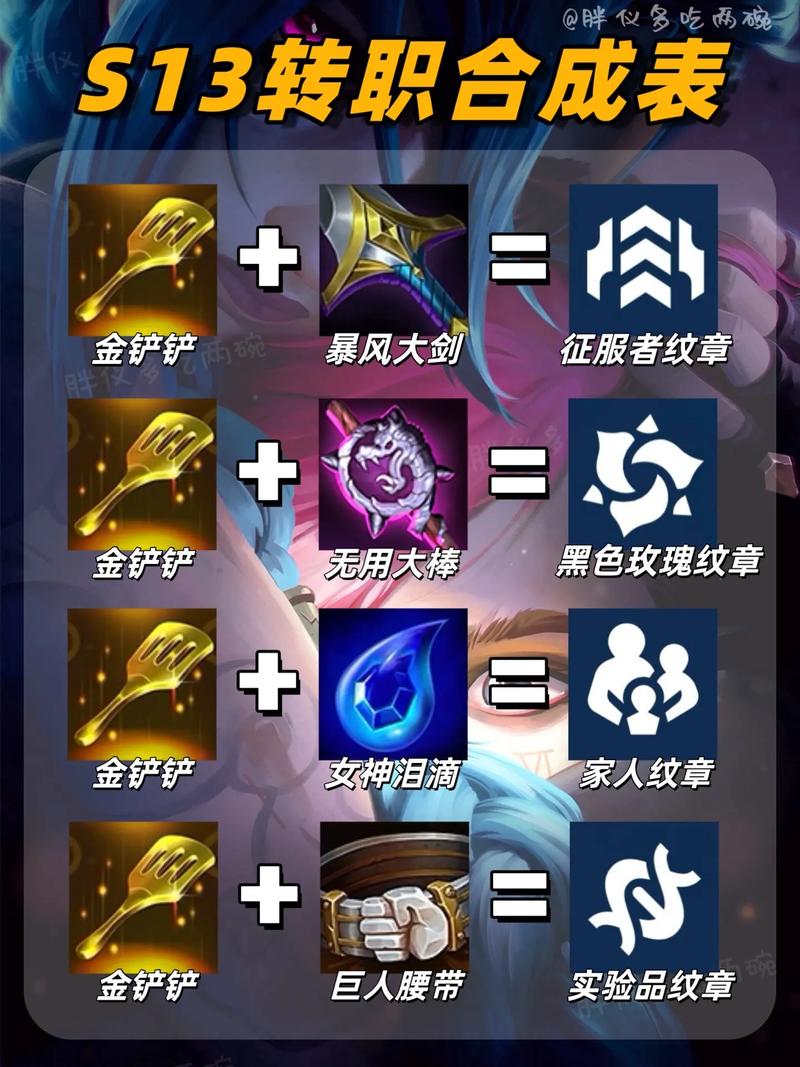 在《云顶之弈》S9赛季中,转职道具的合成路线对于玩家来说至关重要。以下为金铲铲之战S9转职合成表的详细解析: 合成转职道具“恕瑞玛纹章”:需要将金铲铲与大棒相结合。 合成转职道具“挑战者纹章”:通过金铲铲与攻速装备搭配而成。