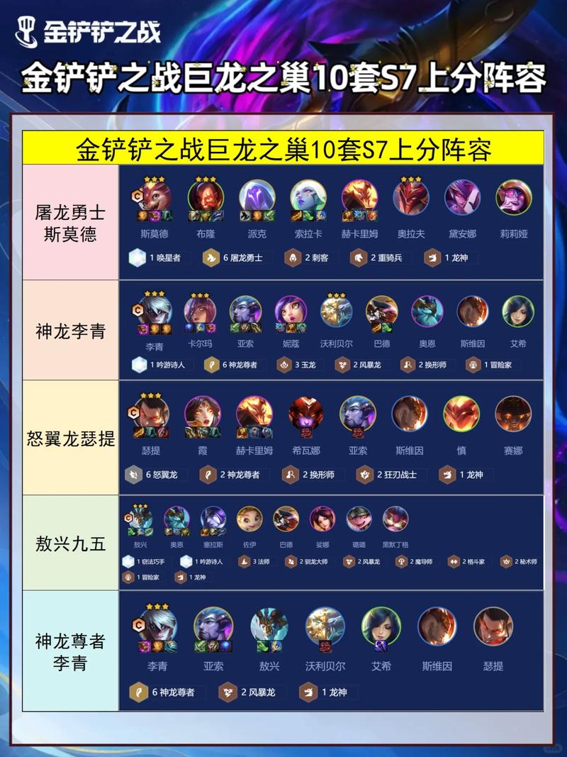 〖Five〗、金铲铲之战S7玉龙半神阵容的玩法和站位详解如下:玩法要点 前期过渡:使用卡尔玛作为过渡角色,并为其装备法术物品。尽量累积经济资源,确保阵容稳定过渡。 中期成型:在37阶段升至7人口,开始搜寻六玉龙三半神的完整阵容。出售卡尔玛,将其装备转给凤凰,并确保凤凰和狗熊达到2星。