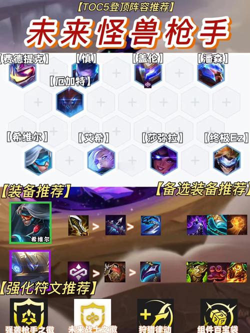 必拿:精密之心、精密之冕、升级咯、+1人口、高端购物、意外之财。这些海克斯强化能够大幅提升阵容的成型速度和整体强度。次选:后排之迅、直击弱点。这些海克斯强化可以增强阵容的输出能力,提高生存能力。装备搭配 主C泽丽:必备装备为电刀和正义之拳,其他装备可选取无尽之刃、珠光护手或帽子等输出装。