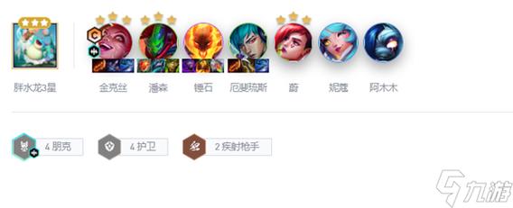 〖One〗、阵容构成 所需弈子:金克丝、潘森、锤石、厄斐琉斯、蔚、妮蔻、阿木木。组成羁绊:4朋克、4护卫、2疾射枪手。该阵容以朋克和护卫羁绊为核心,提供强大的输出和防御能力,同时疾射枪手羁绊增强金克丝的输出。