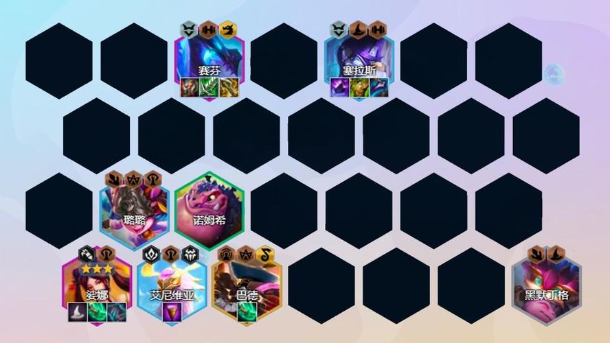 阵容组成与羁绊 阵容成员:赛芬、塞拉斯、璐璐、娑娜(法师纹章)、艾尼维亚、巴德、黑默丁格。阵容羁绊:4幽影龙、3法师、2魔导、2秘术、2驯龙大师。核心思路:利用当前版本法师阵容较多的环境,选取冷门但潜力巨大的娑娜作为主C,通过追三星娑娜来提升阵容强度。
