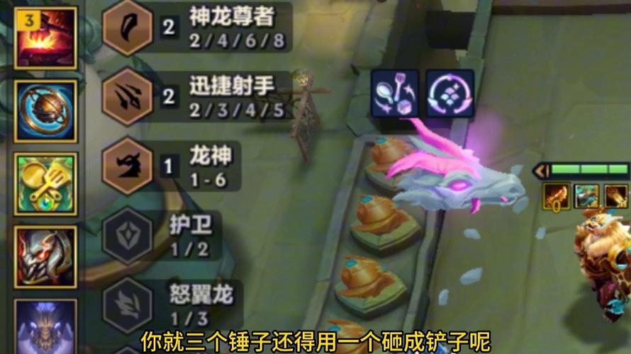 〖Three〗、利用金鳞龙和怒翼龙体系进行打工,如凯隐和剑魔,尽量保持连胜。中期:补充羁绊内棋子,如狗熊和乌鸦,以开出3金鳞龙和3神龙尊者,增强阵容强度。若血量不健康,可提前找霞来稳血。后期:上8人口后,需开出7金鳞龙,并寻找两星霞和佐伊。乌鸦数量多可追三星以提升阵容上限。