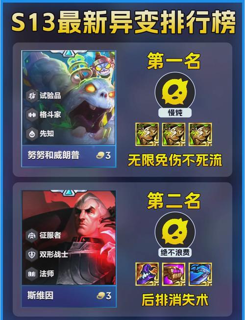〖Two〗、弈子选取:斯维因、普朗克、努努、厄加特、芮尔、特朗德尔、婕拉。羁绊组合:3试验品、2先知、2双形战士、2搏击手、2极客、2格斗家、2法师、2铁血征服者。阵容优点:适合提早拿到努努的玩家,阵容灵活多变,可以根据后续拿到的纹章和装备进行转型,如狙神老鼠、高法体系或搏击手等。