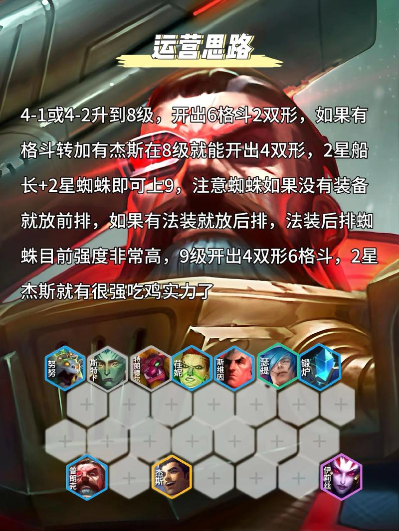 〖Two〗、标准阵容包括:4变形、4搏击手、2哨兵、2极客、2铁血、1机械、1铁手。中期过渡建议:不推荐无脑上4搏击手,可用4极客过渡,有兰博则直接上场培养。特定强化:新版本“好事成双”(变形战士专属)可考虑上2个双形战士,如斯维因和普朗克,获得额外属性加成。
