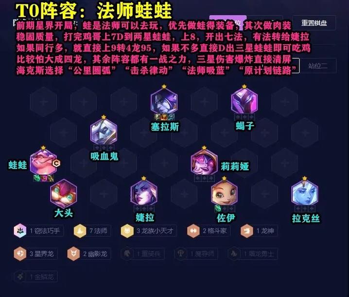 阵容构成: 塔莉垭、斯卡纳、弗拉基米尔、拉克丝、诺姆希、塞拉斯、黑默丁格、佐伊。核心羁绊: 7法师、3星界龙、1龙族小天才、2格斗家、1窃法巧手、1龙神。装备分配: 拉克丝:优先获取圣杯,增加法力回复效率。 诺姆希:推荐珠光护手提升伤害,大天使之杖或无尽之刃增加输出,朔极之矛提高法术强度。