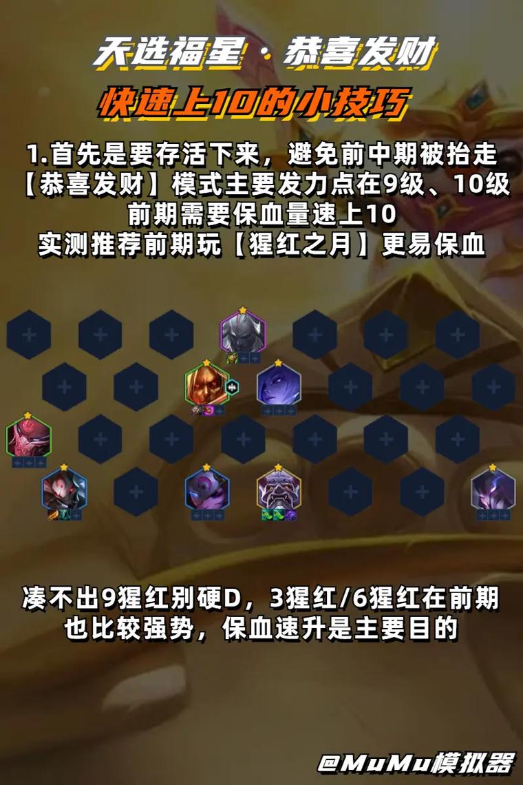 任意英雄,必须拿到天选腥红之月,记住,必须有天选猩红,不然本阵容不成套,战力大降!运营攻略 2阶段 我们随便凑出个3猩红之月,搭配点神盾之类的,战斗力就能稳定下来了,由于本阵容属于超级大羁绊,所以要尽快攒钱,上人口。2-2阶段上4人口,2-4选秀结束之后上5人口。