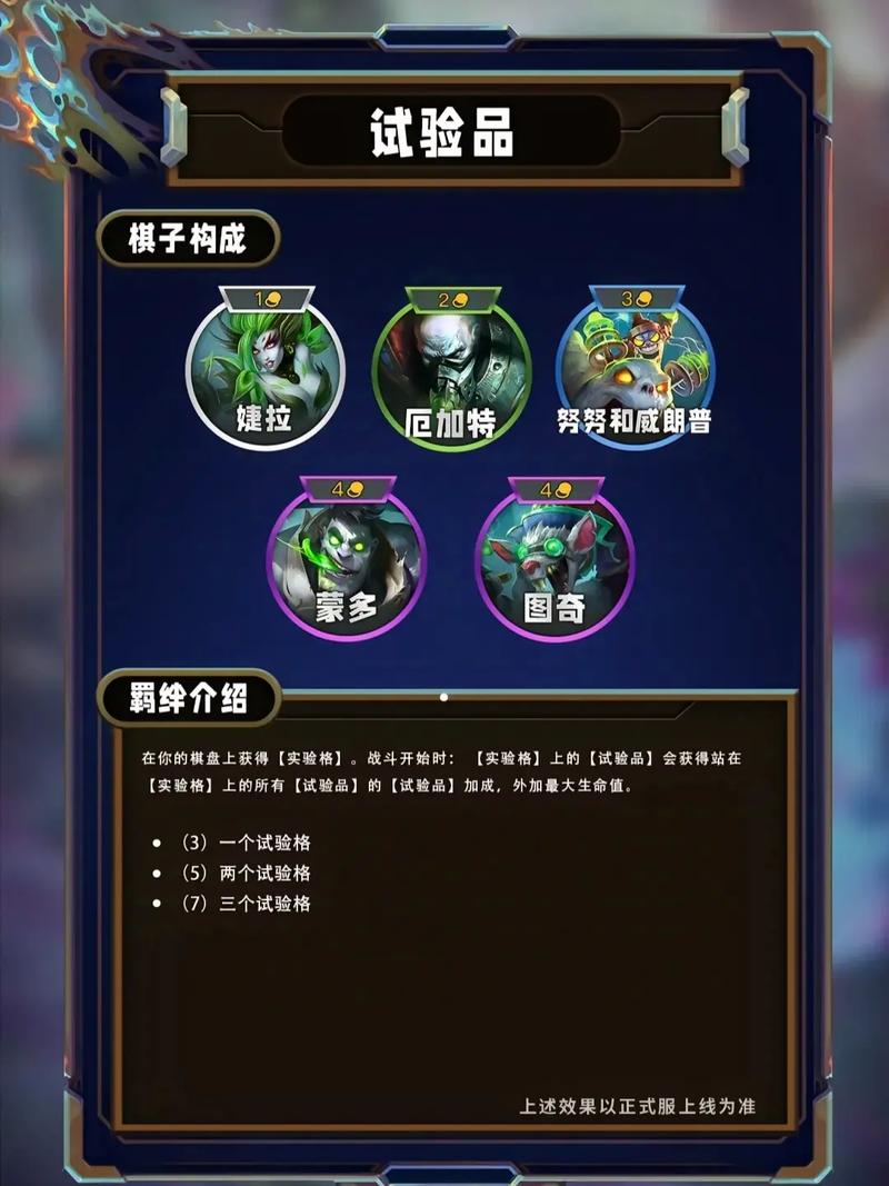 羁绊效果:所有友军获得治疗效果和护盾效果提升。1祖安羁绊:羁绊效果:【祖安】弈子们可以制造仅有他们能用的炼金改件。弈子仅能携带一个改件,并且改件仅能通过售出该弈子来移除。如果改件在备战阶段开始时处在你的备战席那么它将会转换成一个新改件。