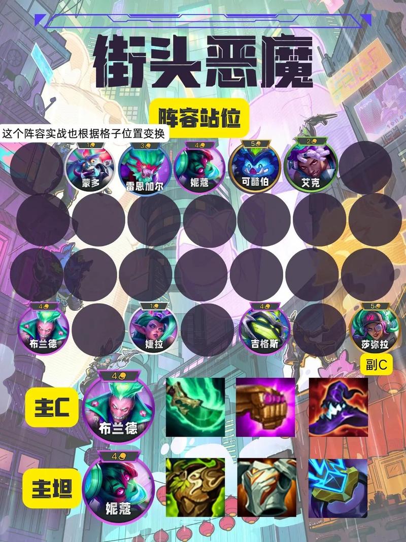 索拉卡(玉龙/唤星)洛(怒翼/护卫)激活羁绊:龙神『2』、怒翼『4』、神龙『3』、幽影『2』、换形『2』、格斗『2』、护卫『2』、迅捷『2』。关键点:龙神作为核心,快速拉人口保经济。转职装备和符文弥补羁绊缺口。8人口成型,后期可升9补强力5费卡。