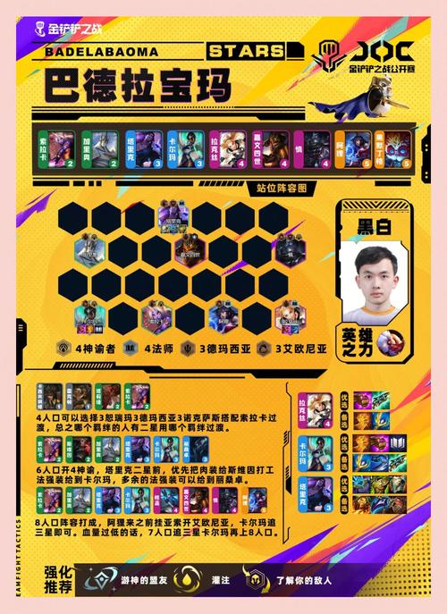 主C德玛:推荐装备为龙牙、板甲和饮血剑,备选装备包括大天使、狂徒、泰坦等。副C莫甘娜/异画师:推荐装备为鬼书和帽子,备选装备包括纳什之牙、法爆等。运营思路 前期运营:在2-1阶段选到传奇英雄海克斯时,选取硬玩。前期尽量不升级,多拿一费卡以增加德玛的出现概率。
