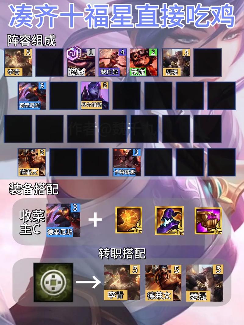金铲铲之战天选福星转九五玩法概览 阵容搭配 羁绊组成:6福星、3战神、2刺客。此阵容以福星为核心,通过福星连败或连胜获取额外战利品,后期转型九五(即9人口全五费卡阵容)追求高战力。强化符文推荐:星界赐福、狩猎律动(增强续航),珠光莲花(提升法术爆发)。
