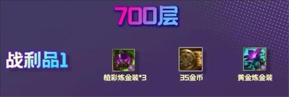 〖Three〗、奖励2:涡轮炼金罐*2 + 45金币。金币可用于购买英雄或升级人口,增强整体战斗力。奖励3:涡轮炼金罐2 + 白银装备2。白银装备虽然属性加成较黄金装备低,但同样能为英雄提供战斗助力。700层奖励 奖励内容:涡轮炼金罐*3 + 35金币 + 黄金炼金装。