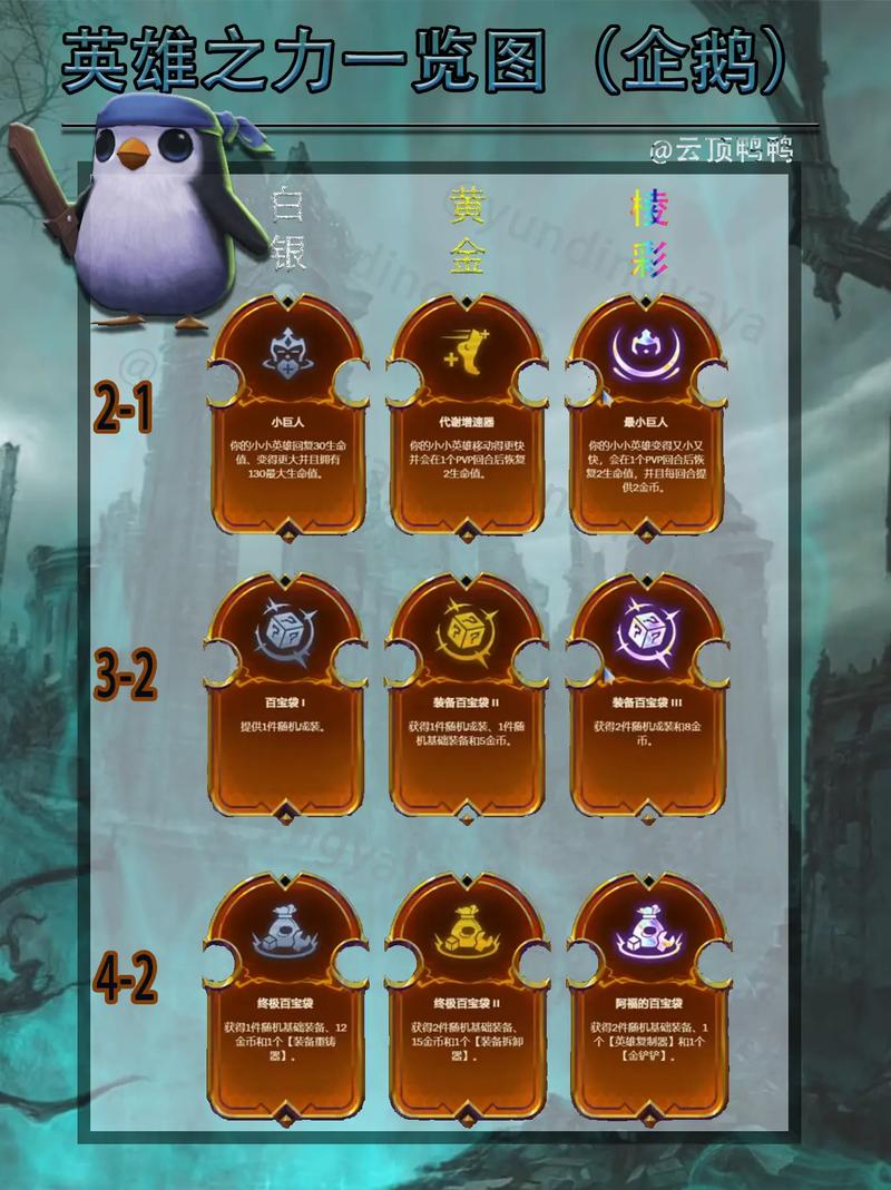 〖One〗、白银级:开摆(前期不行动,积攒经济)、利滚利(提高利息收益)、对冲基金(进一步提升最大利息和金币收益)。适合阵容:后期阵容,需要高额经济来支持阵容成型和升级。英雄之力的多样性与选取 多样性:英雄传说之力总共有14种,每种都有不同的强化符文组合,适合不同的游戏策略和阵容构建。