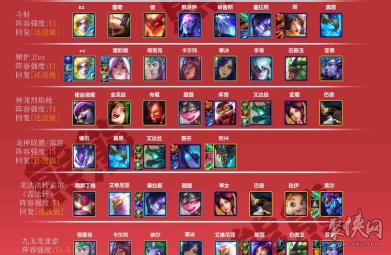 驯龙高手阵容 核心思路:利用驯龙大师和龙族的羁绊,快速召唤出强大的龙魂,形成强大的战斗力。关键英雄:赛娜、艾希、崔丝塔娜等驯龙大师,以及诺姆希等龙族英雄。装备推荐:优先给核心输出英雄如赛娜或崔丝塔娜配备攻速和攻击力装备,如无尽之刃、最后的轻语等。