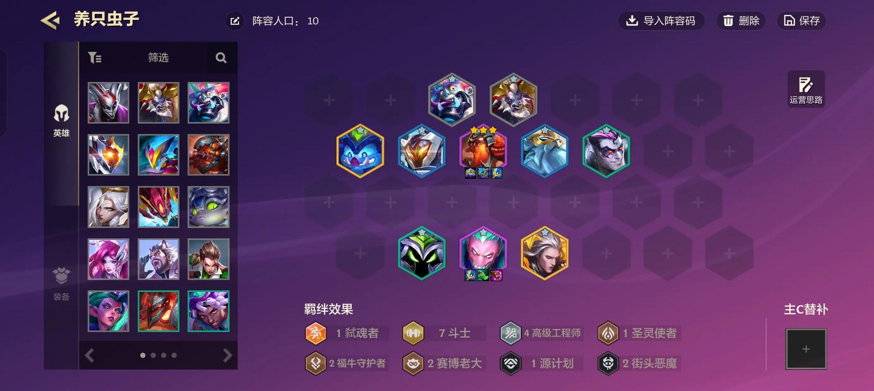 〖Three〗、阵容组成 波比、豹女、龙女、千珏、烬、莫甘娜、阿萝拉(人造人英雄)、小法、蜘蛛。这九位英雄共同构成了人造人龙法阵容。羁绊组成 4人造人:提供额外的生命值和法术强度加成。4魔装机神:在战斗开始时,三个魔装机神英雄将合体为一个超级魔装机神,拥有强大的生命值和攻击力。