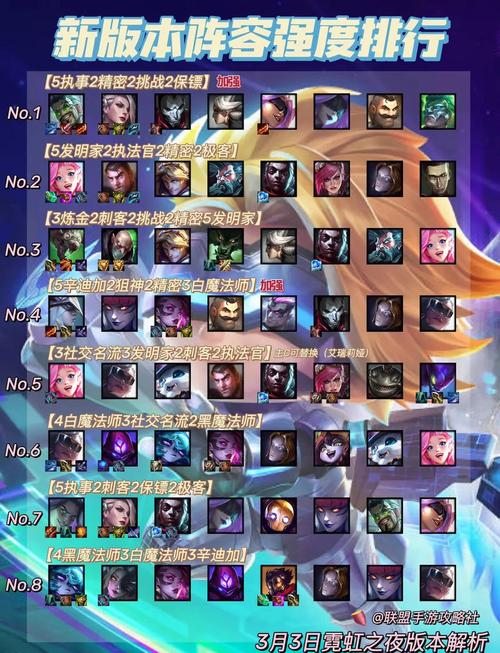〖Three〗、金铲铲之战5霓虹之夜t0最强阵容主要有以下几种:辛迪加狙神 核心英雄:德莱厄斯、婕拉、艾希、莫甘娜、布隆、奥莉安娜、烬、希尔科。阵容特点:艾希的技能改动极大加强了其在前中期的过渡能力,使得辛迪加狙神阵容成为T0级别。莫甘娜的坦度和寒冰的输出能力共同构成了该阵容的强大战斗力。
