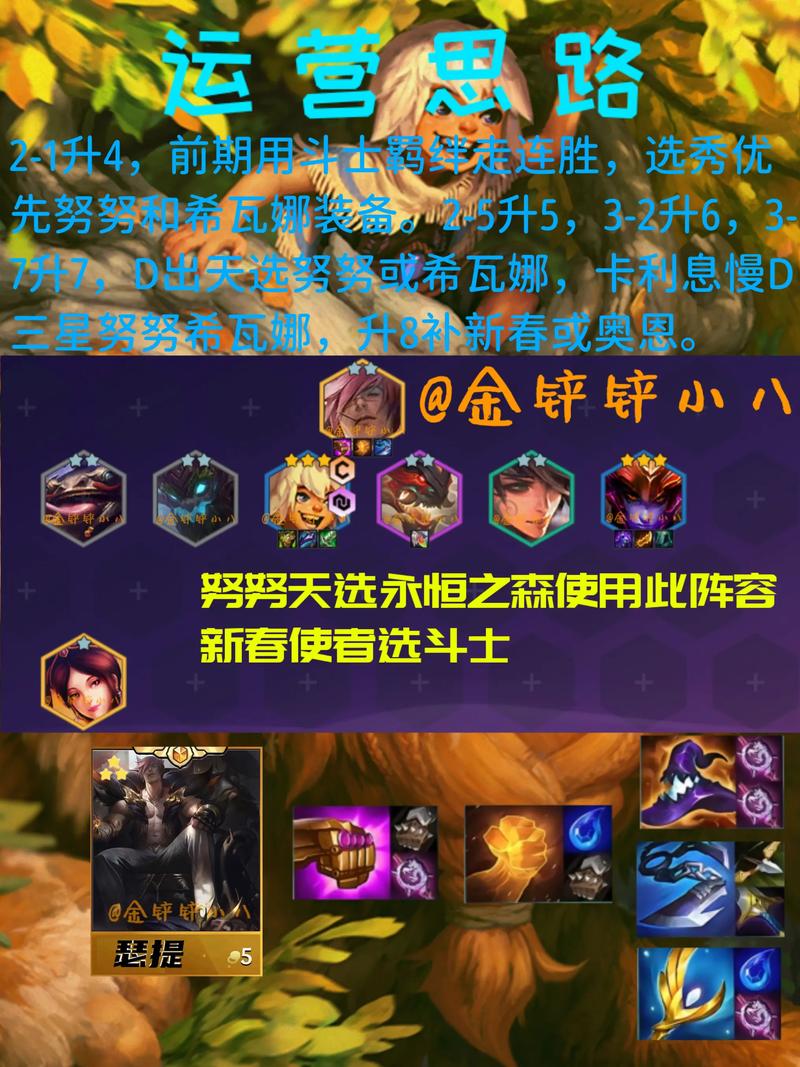 推荐选取电火花、复苏之风、狩猎律动、神龙尊者之徽、阿福的百宝袋、见习英豪等强化符文,以进一步提升阵容的整体实力。运营思路:初期:寻找金铲铲以合成神龙尊者转职装备,若无则优先风暴剑。结合龙转优先使用,若无法合成,斗篷亦可作为替代输出装备。中期:32阶段提升至6人口,根据情况调整阵容。