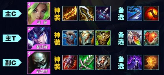 豹女、皇子、盖伦、莎弥拉、沙皇、蛮子、希维尔、蔚和派克,组成羁绊为6三国猛将与4神射手和3战神,形成强大战斗力。此阵容中,豹女是主C位,需要装备蓝霸符和法爆,第三件装备选取巨杀,若无巨杀,可选青龙刀或帽子;皇子则需要离子火花、救赎和石像鬼板甲。