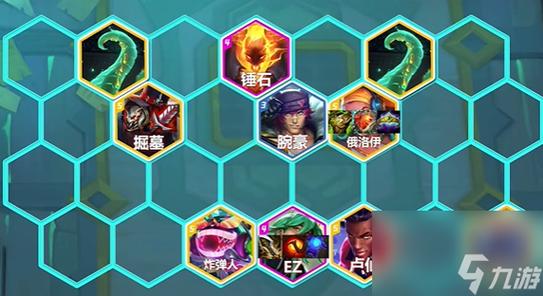 阵容组成核心英雄为EZ,搭配腕豪、掘墓、俄洛伊、锤石、女枪、巴德、炸弹人、卢锡安。该阵容通过多羁绊联动提升输出与生存能力,其中EZ作为主C承担核心输出任务。