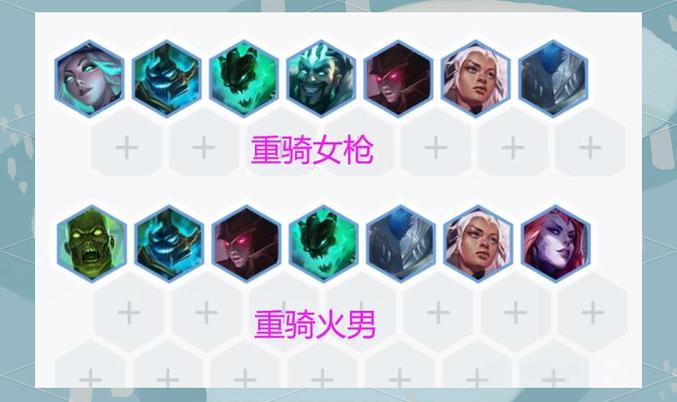 〖Three〗、阵容搭配 4破败3重骑兵阵容:成员:女枪、人马、锤石、德莱文、猪妹、泰坦和芮尔。羁绊:4破败+3重骑兵+2骑士+2铁甲。如果能获得破败转职,可升级为8人口阵容,使用佛耶戈替换某成员,形成6破败,保持高输出。重骑火男阵容:成员:火男、婕拉、人马、猪妹、泰坦、锤石、芮尔。