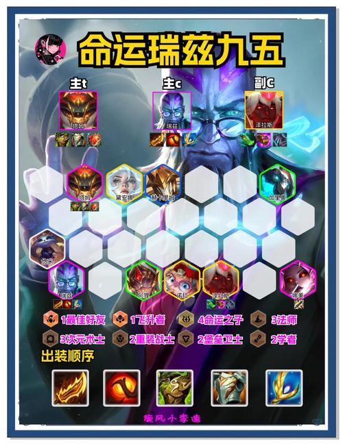 〖One〗、金铲铲之战S12学者九五阵容装备搭配及运营攻略 阵容组成与羁绊该阵容核心英雄为瑞兹、宝石、丁真、皎月、洛、塔姆、莫甘娜、加里奥、泽拉斯,通过学者羁绊提升弈子能力,形成95阵容。羁绊效果包括1飞升者、1蝙蝠女王、3次元、2命运、2花仙、2堡垒、2复苏、2学者、2重装,兼具爆发与控制能力。