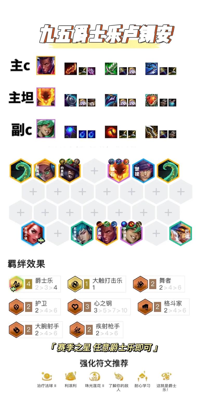 阵容分析 该阵容由飞机、小炮、金克斯、璐璐、巴德、艾达丝和琴女组成。这一搭配的核心在于利用金鳞龙和炮手的羁绊效果,打出高额的输出和控制。