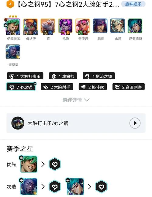 《金铲铲之战》S10心之钢95阵容推荐如下:角色搭配 核心角色:伊泽瑞尔、俄洛伊、烬、凯隐、奇亚娜、瑟提、永恩、厄斐流斯、奎桑提。羁绊选取:1大触打击乐、1戏命师、1影流之镇、7心之钢、2大腕射手、2格斗家、2音浪刺客。