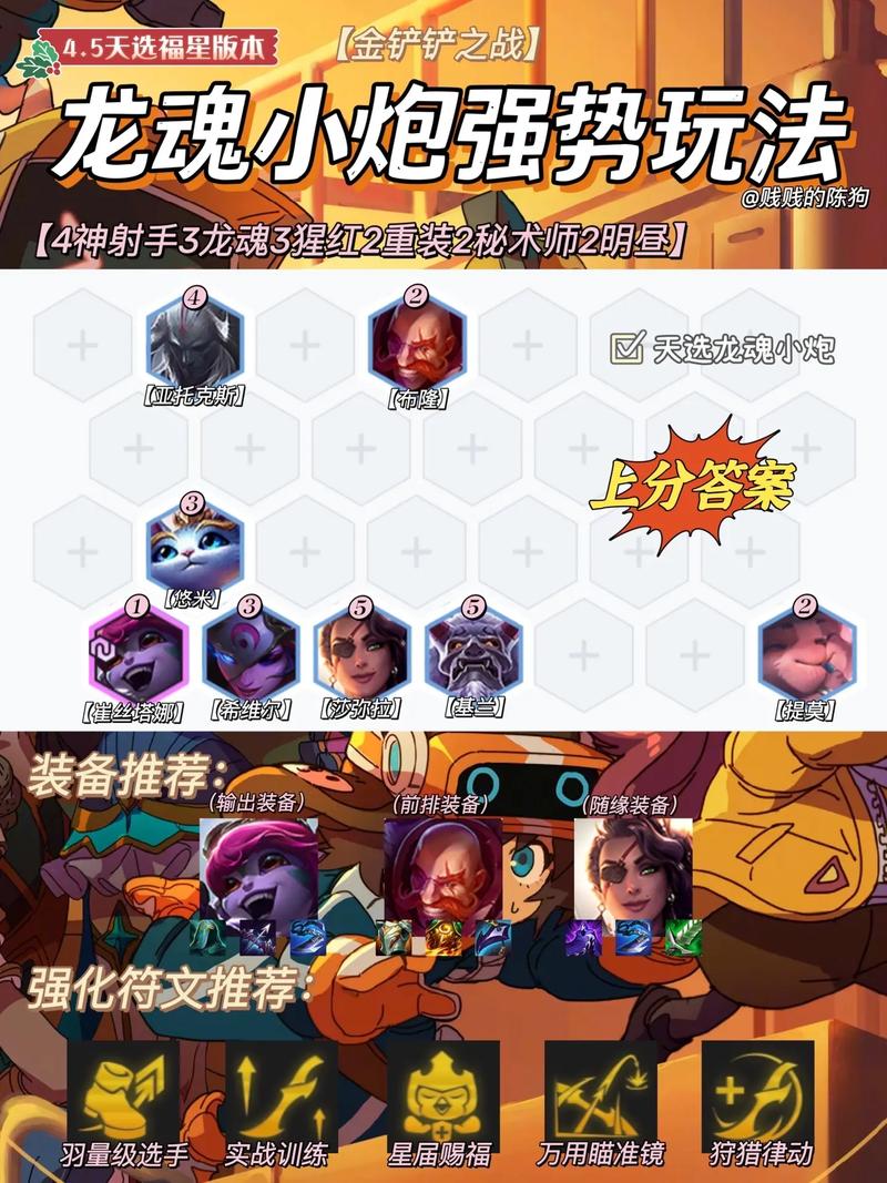〖Six〗、阵容选取 小炮的羁绊是龙魂和神射手,因此建议构建以龙魂为核心的阵容,同时搭配神射手羁绊以提升输出能力。如果要让小炮作为主C(核心输出),推荐采用赌狗龙魂阵容。这种阵容需要在前期积极D牌,追求小炮和其他关键英雄的三星,以快速形成战斗力。装备搭配 小炮的装备推荐以攻速和攻击力为主。