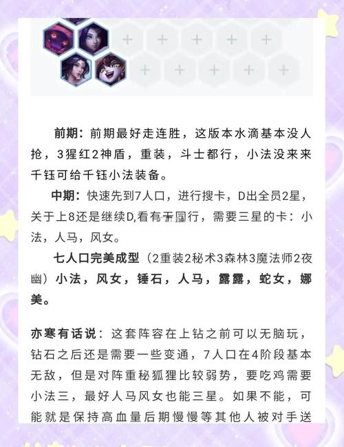 〖Three〗、云顶之弈S4福星三国阵容搭配推荐如下:阵容组成 核心英雄:卡特(天选之人,主C),盖伦,皇子,阿卡丽,蔚(或金克斯),豹女(或塔姆),猪妹,沙皇,瑟提。装备选取 卡特:作为主要输出点,装备推荐为法爆(提升技能伤害)、无尽(增加暴击伤害)和复活甲(提供复活机会,增加生存能力)。
